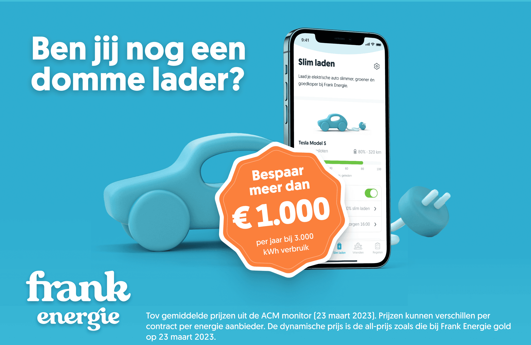 Het mooie is, je kan dit gedrag zonder moeite veranderen. Je kan groenere, goedkopere energie verbruiken, en de energietransitie versnellen door over te stappen op de dynamische tarieven van Frank Energie en slim te gaan laden. Met een dynamisch contract zijn de energieprijzen elk uur anders, afhankelijk van de hoeveelheid (groene) stroomproductie en de vraag op dat moment. Met een dynamisch contract wordt het dus logisch om op te laden op momenten dat er veel groene energie opgewekt wordt, of juist als er bijna geen vraag naar stroom is. Met slim laden wordt dit automatisch voor je geregeld.